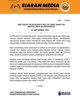 针对美里国家青年技术学院(IKBN)近日爆出的霸凌事件,青年及体育部发布文告表示,将依据现行规章及纪律程序,严肃处理涉事学生,包括可能面临停学甚至开除的纪律处分。
