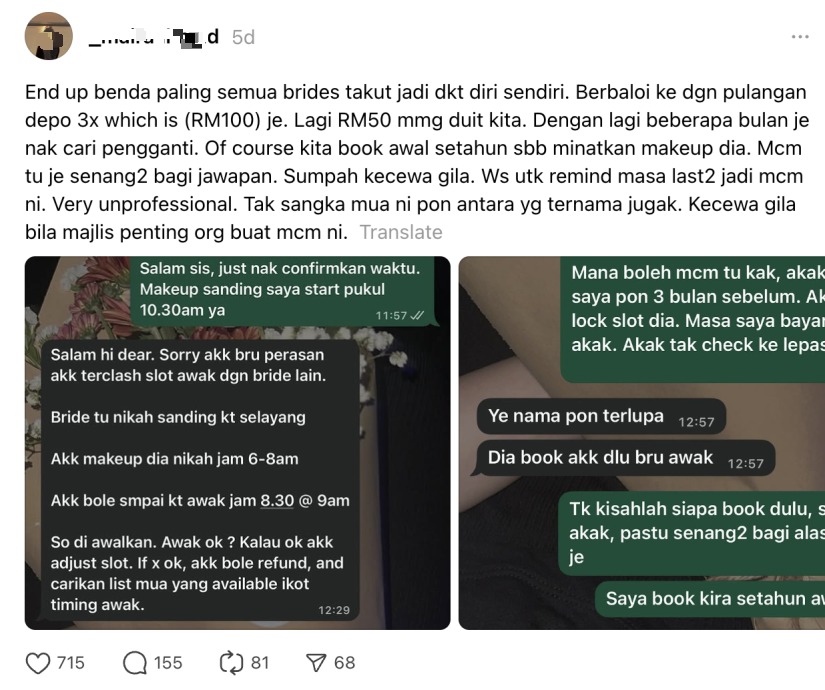 这名新娘直言无法接受,强调自己早已缴付100令吉订金,却被“遗忘”了档期。“婚礼是人生大事,每一个环节都必须精准无误,这样的疏忽让我很难原谅。”