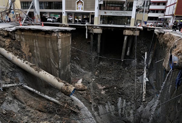 泰国曼谷市区周三(24日)上午发生严重路面坍塌,瓦吉拉医院前路段连续两次陷落,形成长宽约30公尺、深达50公尺的巨大天坑。