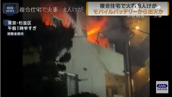 日本东京杉并区一栋五层公寓周四凌晨突发火警,6人因吸入浓烟被紧急送医。调查发现,起火源头竟是一名少女睡前用充电宝替手机充电,半夜爆炸起火,导致火势迅速蔓延。
