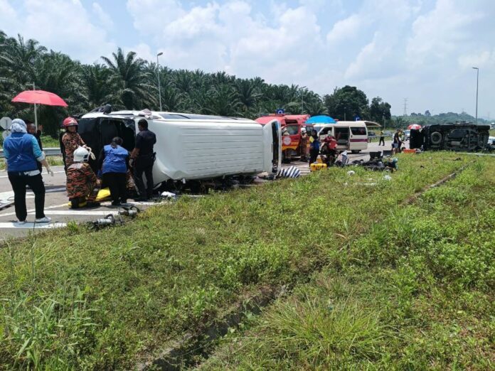 砂拉越木中今午发生一起严重车祸,两辆车猛烈碰撞后酿成惨剧,一辆客货车失控侧翻,造成2人当场丧命,另有9人受伤送院。