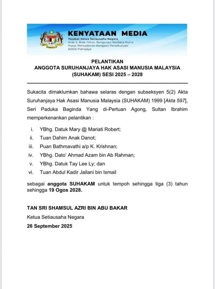 根据政府首席秘书丹斯里三苏阿兹里今日发出的文告,这项委任是根据《1999年马来西亚人权委员会法令》第5(2)条文所进行。