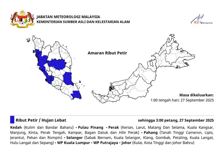 马来西亚气象局今日(9月27日,星期六)发布短期雷暴预警,预计吉打(居林、万拉峇鲁)、槟城、霹雳(吉辇、拉律峇登司南马、江沙、曼绒、近打、中霹雳、金宝、峇眼拿督及下霹雳)、彭亨(金马仑高原、立卑、而连突、北根及丰盛港)、雪兰莪(沙白安南、瓜拉雪兰莪、巴生、鹅唛、八打灵、瓜拉冷岳、乌冷及雪邦)、联邦直辖区吉隆坡与布城,以及柔佛(古来、哥打丁宜及新山)将持续出现雷暴、大雨及强风天气,直至下午3时。