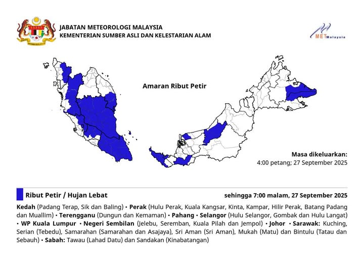马来西亚气象局今日发布预警,预计吉打(巴东得腊、昔县、华玲)、霹雳(上霹雳、江沙、近打、金宝、下霹雳、峇登巴当、慕亚林)、登嘉楼(龙运、甘马挽)、彭亨、雪兰莪(乌鲁雪兰莪、鹅唛、乌鲁冷岳)、吉隆坡直辖区、森美兰(日叻务、芙蓉、瓜拉庇劳、仁保)、柔佛,以及砂拉越(古晋、西连〔打必律〕、三马拉汉〔三马拉汉、亚沙再也〕、斯里阿曼〔斯里阿曼〕、沐胶〔马都〕、民都鲁〔达斗、诗巫〕),还有沙巴(斗湖〔拿笃〕、山打根〔京那巴当岸〕)将出现雷雨、暴雨及强风,警报有效至 2025年9月27日(星期六)晚上7时。
