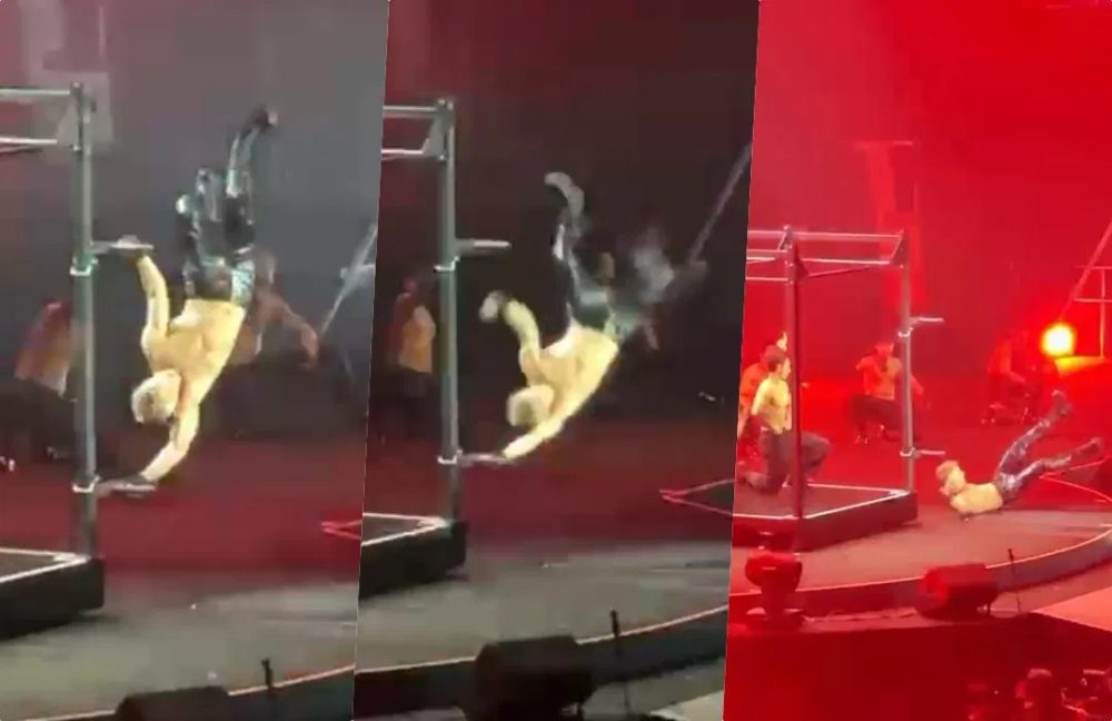 现场观众上传的影片显示,当时关智斌与多名半裸舞者带来充满力量感的劲歌热舞。舞台中央设置了大型街头健身架作为表演道具,在歌曲后段,他攀上架子尝试完成倒立翻转动作。就在发力瞬间,疑因手部打滑失去重心,整个人重重向后跌落,背部先着地,撞击声清晰可闻。台下观众惊呼,舞者们也立刻冲上前搀扶。