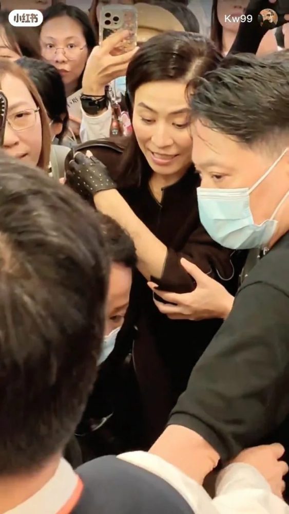工作人员与保安紧急筑起人链保护宣萱,助手更贴身护驾。但因场地过于狭窄,加上人群推挤,宣萱一度寸步难行,甚至数次差点跌倒,脸上更显露出惊慌与不安。她在走向商场扶手电梯时,还担心助手跌倒而大声提醒,场面险象环生。