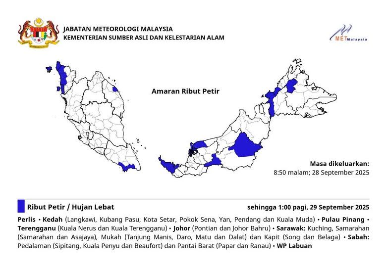 预计在霹雳州、吉打州(包括兰卡威、古邦巴素、哥打士打、波各新纳、彦、奔当及瓜拉姆达)、槟城州、登嘉楼州(包括瓜拉尼鲁斯及瓜拉登嘉楼)、柔佛州(丰腾及新山市)、砂拉越州(古晋、三马拉汉区(含三马拉汉及阿沙加亚)、木胶区(丹戎马尼斯、达鲁、马图及达拉)、加帛区(松及贝拉加))及沙巴州(内陆地区:西必塘、瓜拉奔尤及保佛;西海岸地区:巴帕及拉奈)、联邦直辖区纳闽,可能出现雷暴、暴雨及强风。