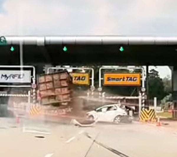 画面进一步显示,失控罗厘追尾一辆本田City轿车,强大冲击力将轿车拖行数十公尺并旋转一圈,罗厘则继续往前,猛烈撞进SmartTAG收费通道,再波及宝腾X70休旅车与日产SUV,场面触目惊心。