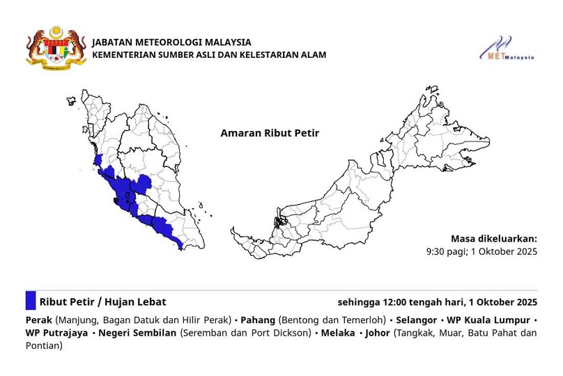 预计天气警示:霹雳、彭亨、雪兰莪、吉隆坡、布城、森美兰、马六甲及柔佛部分地区将出现雷暴、大雨及强风
