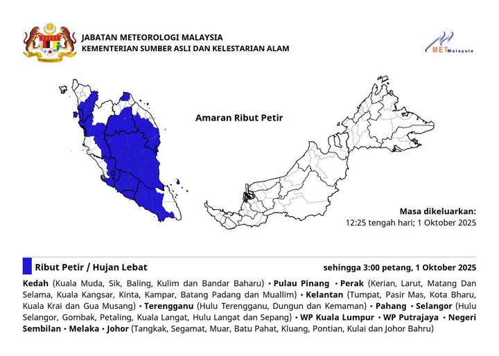马来西亚气象局指出,预计今日(10月1日,星期三)下午3时前,吉打(瓜拉姆达、锡、华玲、古林、万拉峇鲁)、槟城、霹雳(吉辇、拉律、马登及仕林、江沙、近打、金宝、峇眼拿督及穆阿林)、吉兰丹(道北、巴西马、新山、话望生及话望生)、登嘉楼(乌鲁登嘉楼、龙运及甘马挽)、彭亨、雪兰莪(乌鲁雪兰莪、鹅唛、八打灵、瓜拉冷岳、乌鲁冷岳及雪邦)、吉隆坡、布城、森美兰、马六甲,以及柔佛(东甲、昔加末、麻坡、峇株巴辖、居銮、笨珍、古来及新山)将出现雷雨、豪雨及强风。