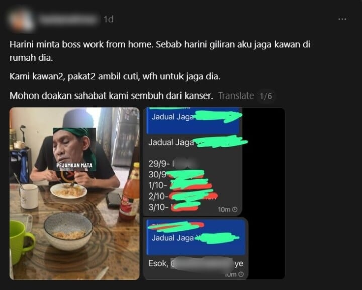 男子哈齐克在社交平台Threads分享,他已向上司请示改为居家办公,好腾出更多时间陪伴正与癌症抗争的好友。