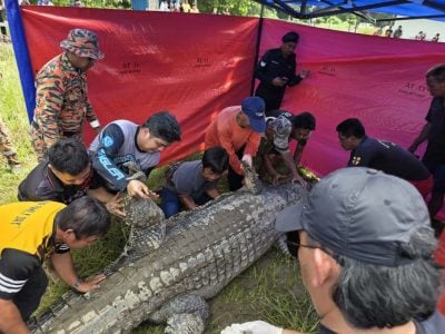 砂拉越达岛发生鳄鱼夺命惨剧,一名21岁青年在河边洗澡时遭巨鳄拖入水中,失踪多日后,今早当地搜救队联合巫师设陷捕获一条鳄鱼,剖腹检验时赫然发现包括头部在内的人体残骸,疑为失踪者遗体。