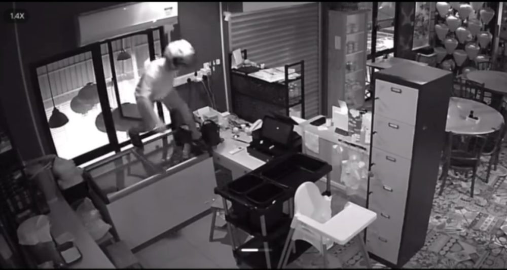 古晋一家知名餐厅凌晨惊传窃案!三名窃匪潜入餐厅,企图撬开正门失败后,竟从窗户翻入店内。