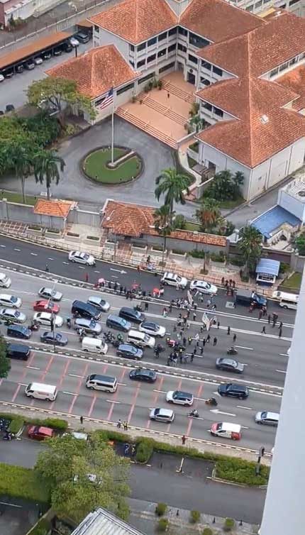 愤怒的群众今日下午聚集在美国驻马大使馆外,抗议以色列军队拦截并扣押“全球坚韧船队”(GSF),现场一度出现混乱,据悉有数名抗议者在过程中被警方带走。