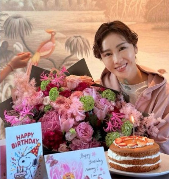 除了女儿的贴心礼物,富豪丈夫马廷强也照例献上“永不缺席”的鲜花,一大束粉嫩花卉与蛋糕相伴,映衬着黎姿满脸幸福笑容。