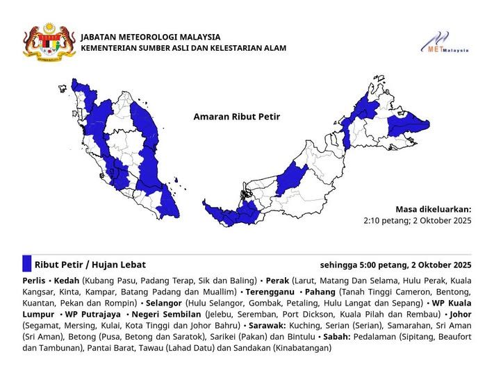 大马气象局发布警报,预计将有雷暴、豪雨及强风,受影响地区包括: