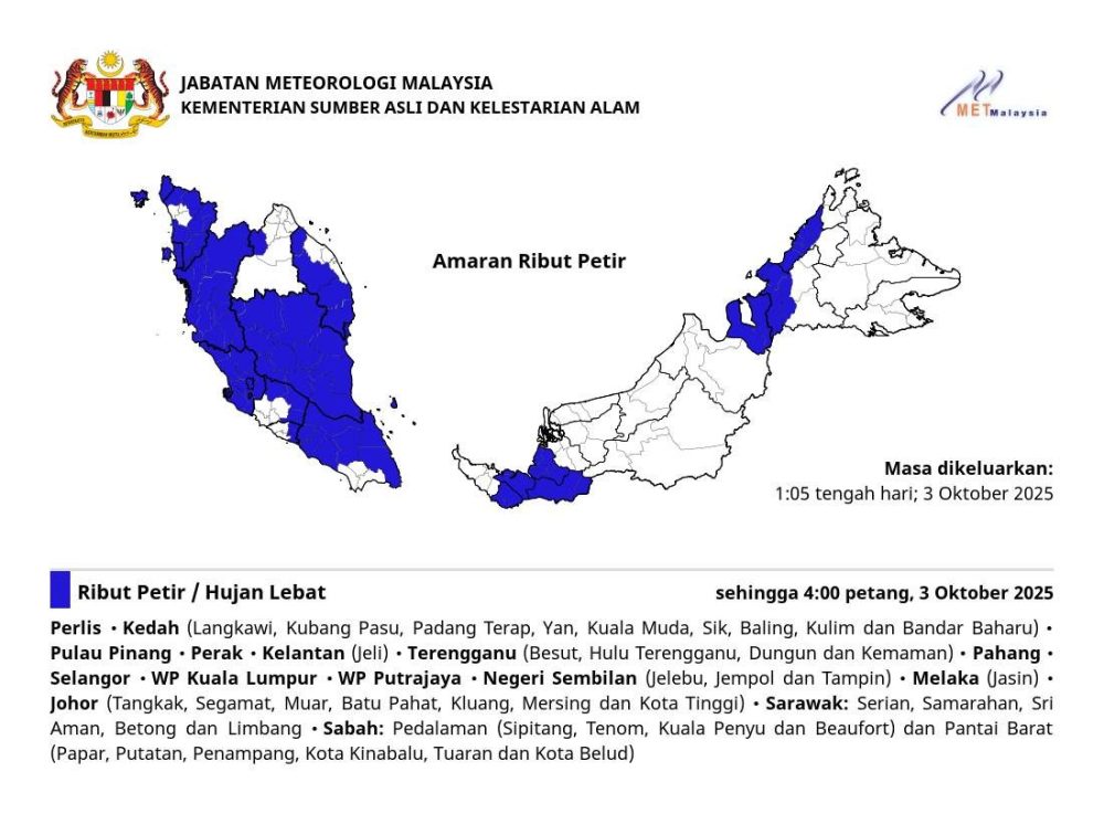 马来西亚气象局(MetMalaysia)预告,今日(10月3日,星期五)多地将出现雷暴、豪雨与强风天气,预计持续至下午4时。