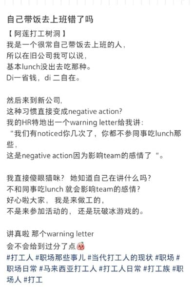 一名大马华裔女子爆料,竟因“没和同事一起吃午餐”而收到公司警告信,让她感到相当荒谬。