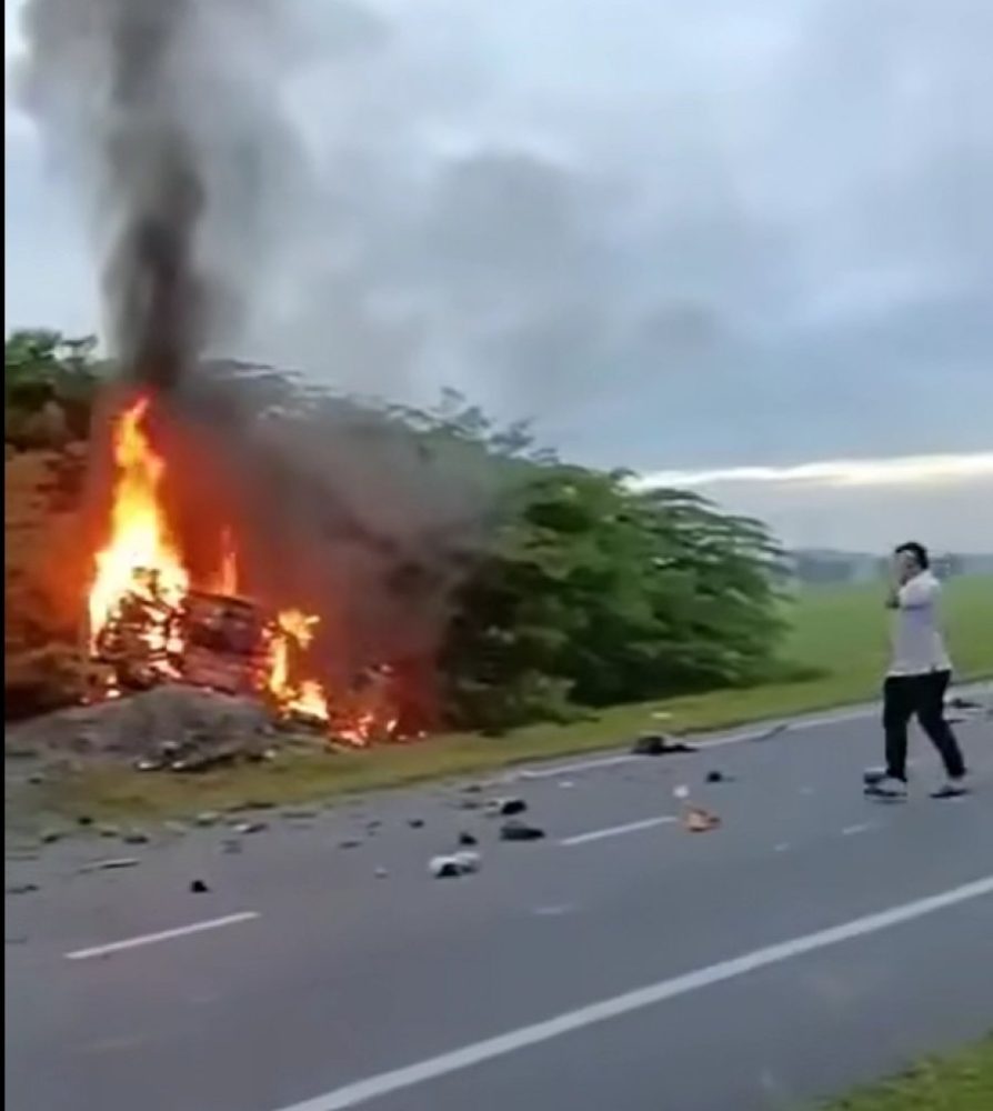 北海今早发生一起夺命车祸!一辆轿车行驶至北干达拉路(Jalan Pekan Darat)往双溪洛干(Sungai Lokan)方向时,疑失控起火,瞬间被烈焰吞噬,车内两人当场惨被烧成焦尸。