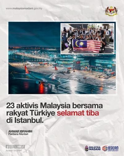 首相拿督斯里安华证实,被以色列当局扣留的23名大马公民已顺利获释,并在土耳其政府全力协助下,于大马时间今天傍晚6时45分搭乘专机自以色列南部拉蒙机场启程,当地时间晚间约9时抵达土耳其伊斯坦布尔。