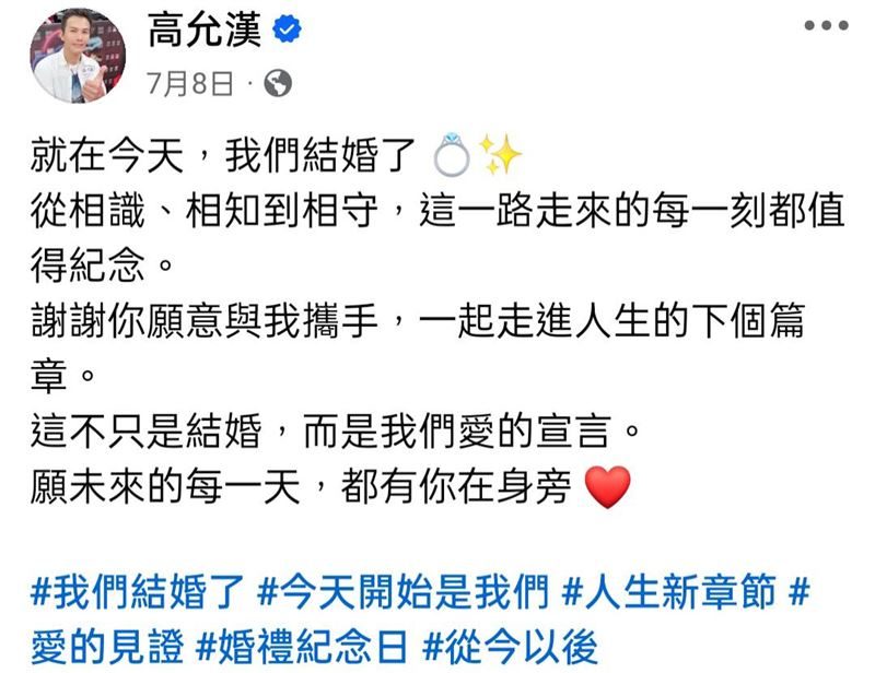 当初他宣布婚讯时搭配《戏说台湾》的剧照,意外让不少网友误以为“女主角”是新娘,高允汉事后紧急澄清,表示真正的另一半是自己的经纪人。