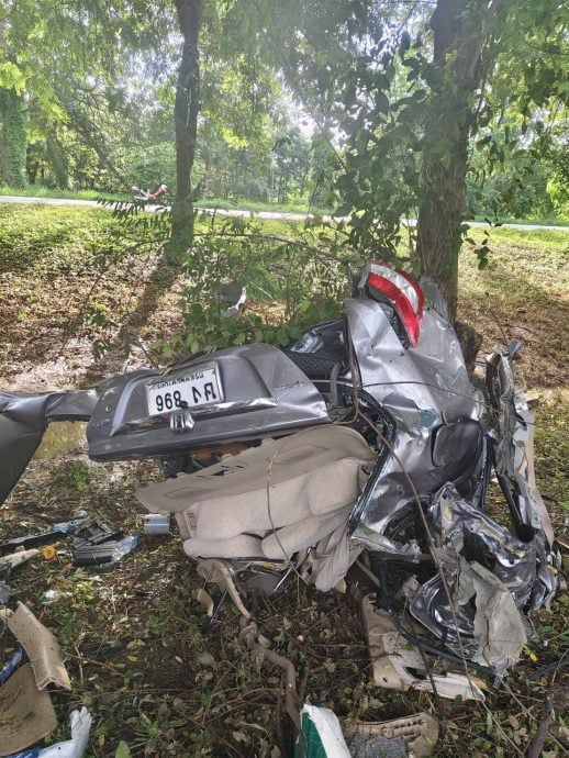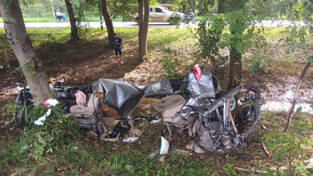泰国呵叻府惊险一幕!一名25岁男子因疲劳驾驶,途中打瞌睡失控狂飙,接连撞上路边多棵大树,轿车当场断成两截、车身扭曲变形,惨烈程度宛如灾难片——但他竟奇迹般活了下来!