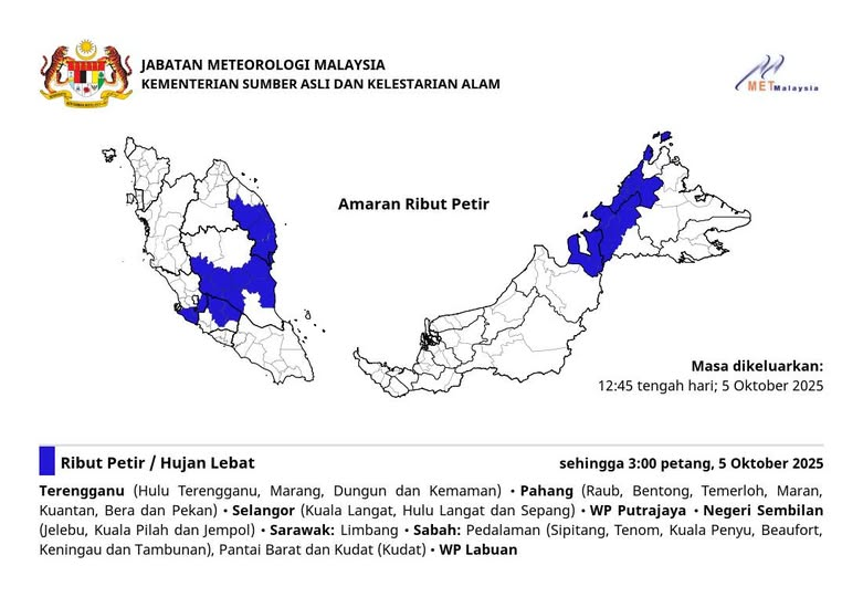 气象局预测,今日(10月5日,星期日)下午3时前,下列地区将出现雷雨、强风及大雨天气: