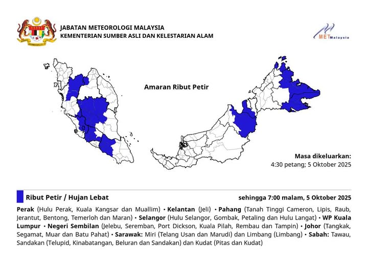 大马气象局今日(10月5日)发出最新预警,指霹雳、吉兰丹、彭亨、雪兰莪、森美兰、柔佛、砂拉越及沙巴多个地区,预计将出现雷暴、豪雨及强风天气,警报将持续至今晚7时。