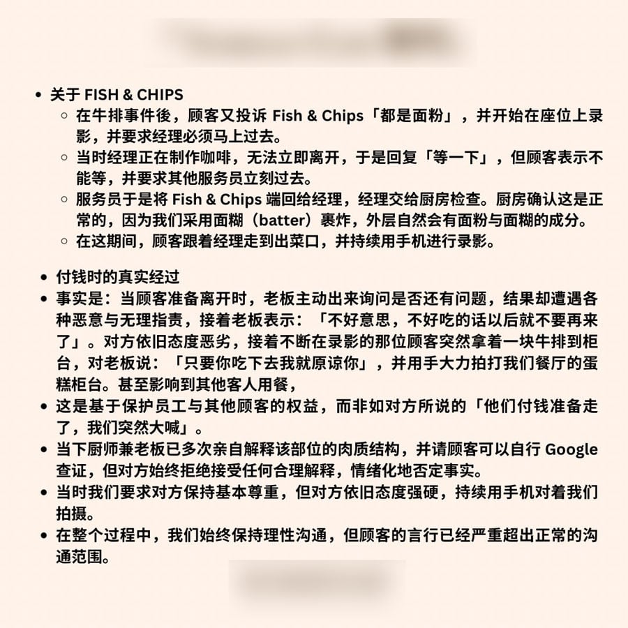 视频中可见,Bryan一边拍摄一边向服务生抱怨,指鱼扒粉太厚,未料服务生冷回一句“难吃就难吃咯”,让他瞬间爆气,甚至跟着服务生走进厨房,一边骂“一间烂店”。