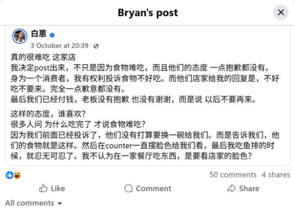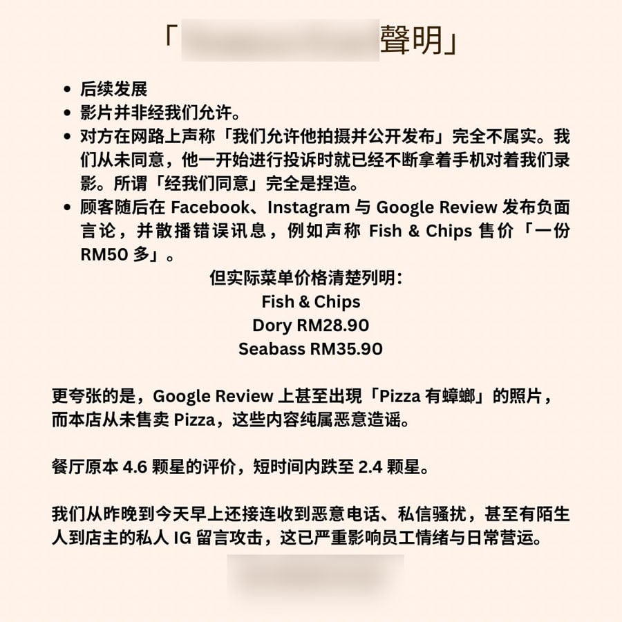 餐厅老板隔日也发文反击,指对方“误导性负评”导致店家Google评分从4.6星跌至2.4星,还附上证据澄清价格并非“50多令吉”。店家强调食物没问题、拒绝退餐,并批评Bryan当众拍摄影响其他顾客。