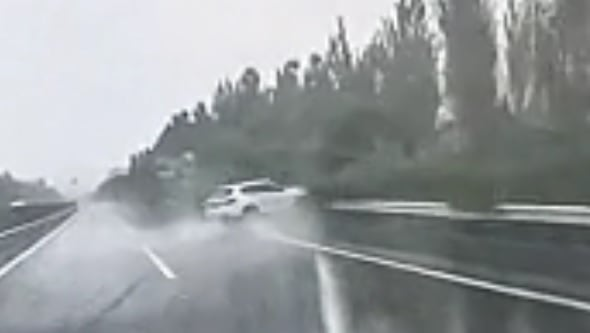 中国山西省高速公路发生一起惊险车祸,一辆白色SUV疑似在雨天行驶中打滑失控,先后撞上中央隔离带和路边护栏,过程中一名女子疑因未系安全带,被抛出车外,画面令人震惊。