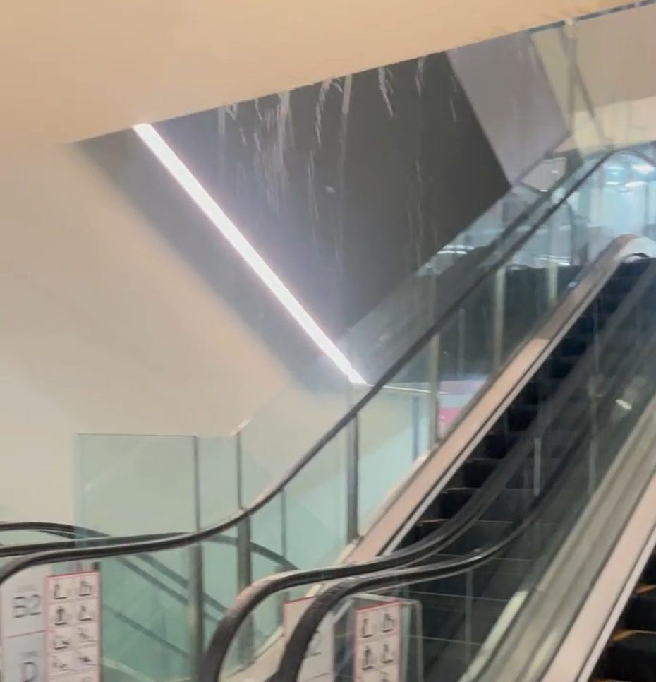 根据小红书用户“一粒马铃薯”上传的视频显示,大雨过后,商场停车场通往底层的手扶梯与电梯区域不断漏水,雨水从上方倾泻而下,犹如瀑布直落。最底层停车区则出现大面积积水,车辆出入受阻。
