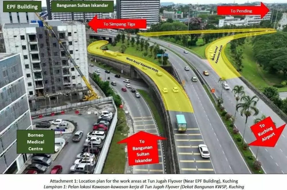 根据《诗华日报》报道,为配合施工进度,古晋敦朱加高架桥(Tun Jugah Flyover)靠近公积金局大厦(KWSP)附近路段将于10月6日至17日实施为期12天的夜间临时封路措施。