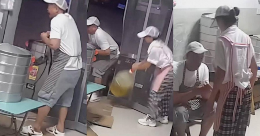 中国浙江永康一间早餐店上演惊险一幕:店主在维修电线时不慎触电,危急关头,妻子情急之下抄起油桶猛砸电线,硬生生将丈夫从死神手中救出。