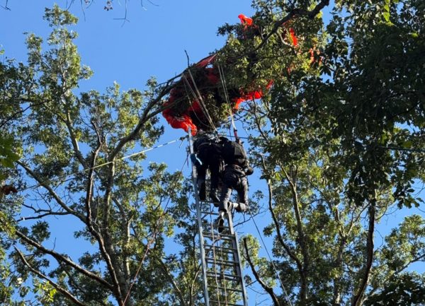 然而在降落途中,两人竟不明原因意外分离。学员被发现时,降落伞已经打开,却卡在一棵约15米高的大树上。他被困在半空中长达数小时,最终由消防员利用滑轮系统和梯子成功救下,所幸并无大碍。