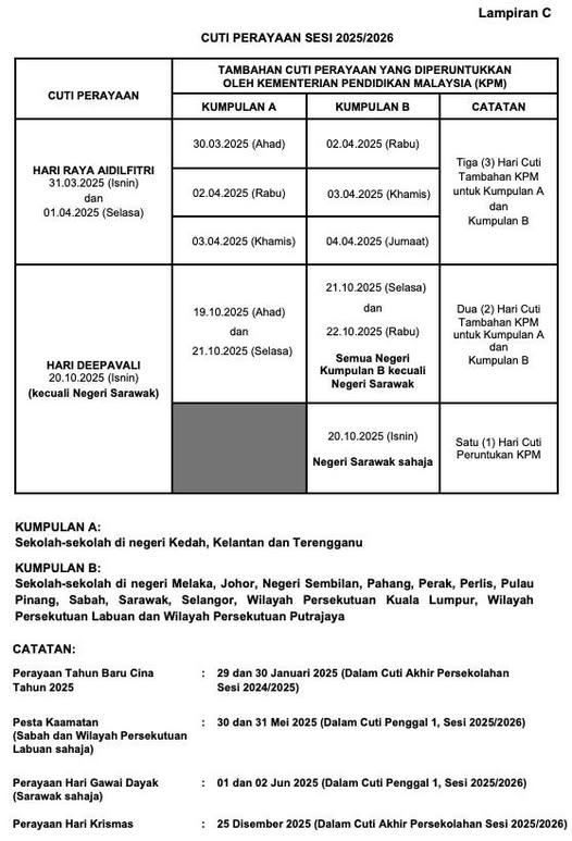 - A组:吉打、吉兰丹及登嘉楼州学校,将于10月19日(周日)和10月21日(周二)放假。