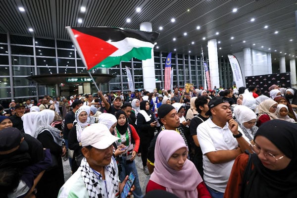 数百名支持者手持“坚守坚韧”“欢迎人道英雄归来”标语,身披巴勒斯坦特色服饰,今晚聚集在吉隆坡国际机场第一航站楼,迎接23名刚从以色列获释回国的“全球坚韧船队”(GSF)大马志工。