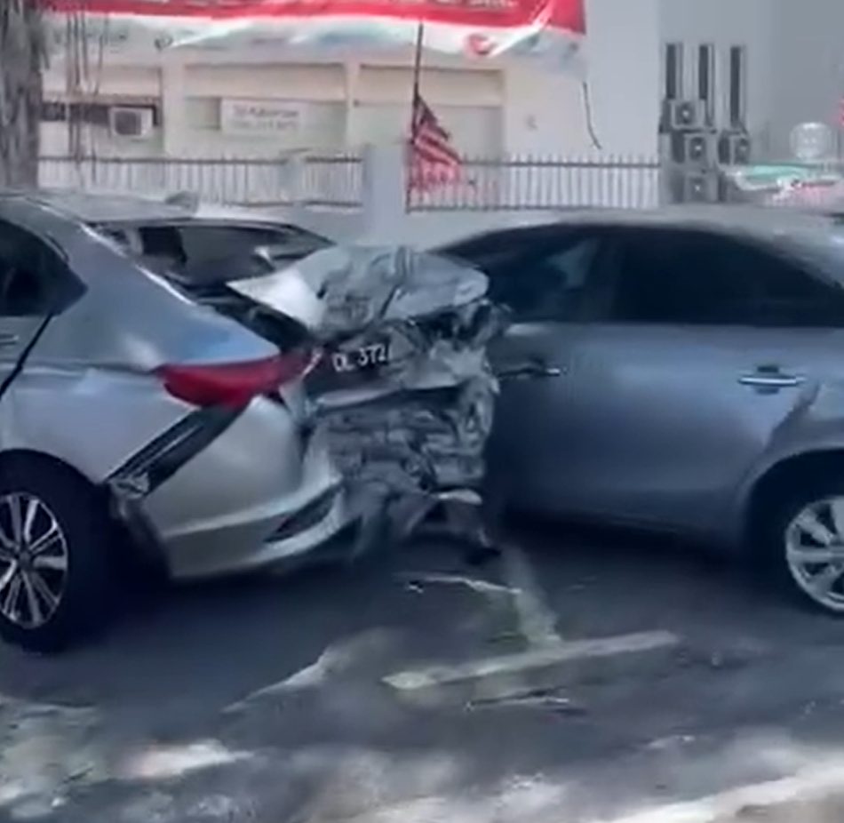 从网传视频画面可见,事故现场位于怡保火车站入口处,左右两侧停车区共有6辆轿车受损——其中,邮政局前方停车格的3辆车受撞击最严重,另一侧的3辆也出现不同程度凹陷与刮痕,现场一度陷入混乱。