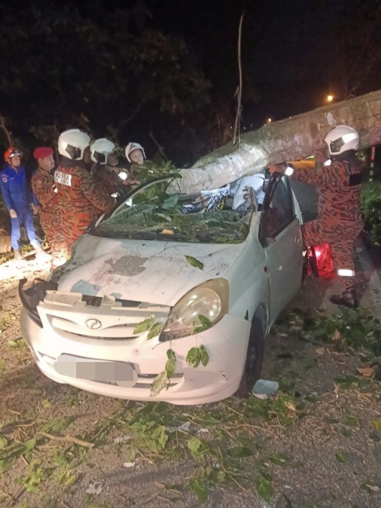 瓜拉庇劳警区主任莫哈末慕斯达法表示,警方于昨晚约11时20分接获报案,指沙哇叻巴(Sawah Lebar)至宋卡(Sungkak)路段发生树倒压车事故。