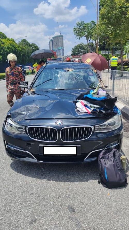 吉隆坡敦拉萨路今午突发树倒意外,一辆行驶中的宝马轿车遭巨树砸中,车头严重凹陷、挡风玻璃碎裂,所幸司机毫发无伤。