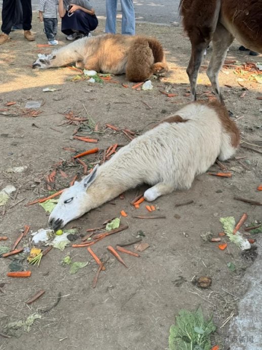 从网友上传的照片可见,至少两只羊驼躺卧在地、表情呆滞,周围散落着大量胡萝卜、白菜等残余食物。一名网友调侃道:“它们真的吃不下了。”还有人晒图表示:“带了五斤红萝卜,扔了四斤。”更有人担心:“这样吃会不会撑死?”也有人指出:“这状态不太对,眼睛都翻白了。”