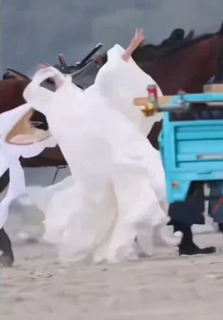 从现场流出的影片可见,孟子义身穿白色古装、头戴长纱帽,站在马匹旁边,地面为松软沙地。当她准备起身行动时,没发现帽纱已被身后的演员踩住,结果刚一移动,帽带猛地将她往后拉扯,整个人瞬间向后弯折、重摔在地,颈部剧烈拉扯,画面惊险,现场人员也都被吓到,演员们立刻上前搀扶她。