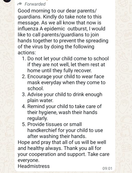 据了解,多间校方已通过 WhatsApp 家长群组发布防疫通知,指出当前正值流感高发季节,学生往返校园人多密集,家长与监护人务必提高警觉、配合防疫。