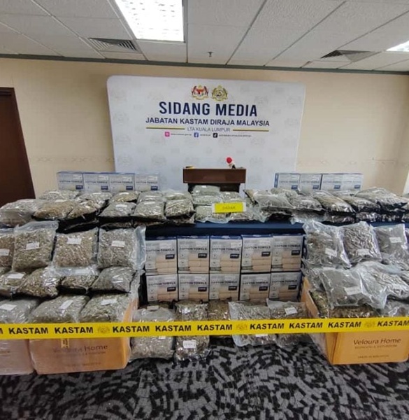 贩毒集团以为用真空包装掩盖大麻花气味、再藏进毛巾包装盒就能瞒天过海,没想到仍被执法人员识破,近1吨、总值高达9803万令吉的大麻花悉数落网!