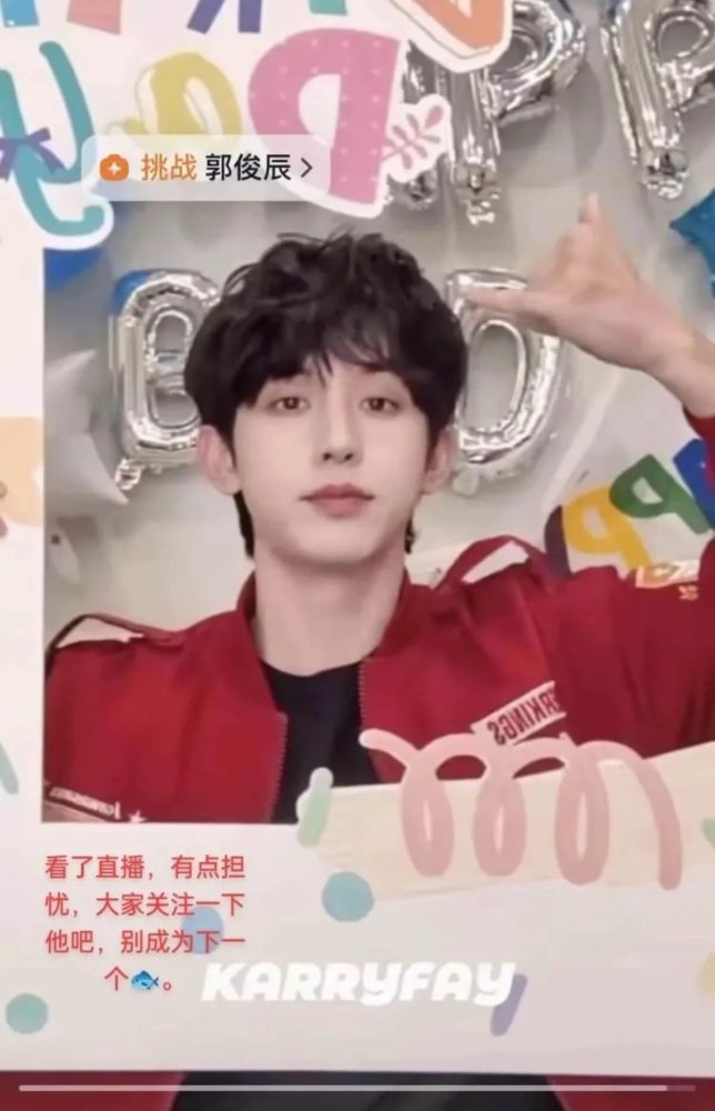 更让网友紧张的是,郭俊辰当天收到的生日蛋糕为红色寿桃造型,上面放有5颗桃子,有人甚至解读为“不祥暗示”,认为蛋糕设计令人“毛骨悚然”。网络上开始流传“他会不会是下一个于朦胧”的言论,不少网友留言表示忧心:“注意安全,保护好自己”、“我不求你红,只求你平安”。