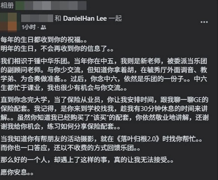李文瀚昔日中学华乐团副顾问老师在面子书发文悼念,哀叹如此善良、努力的学生竟以悲剧收场,直言“无法接受那么好的一个人遭遇这样的结局”。