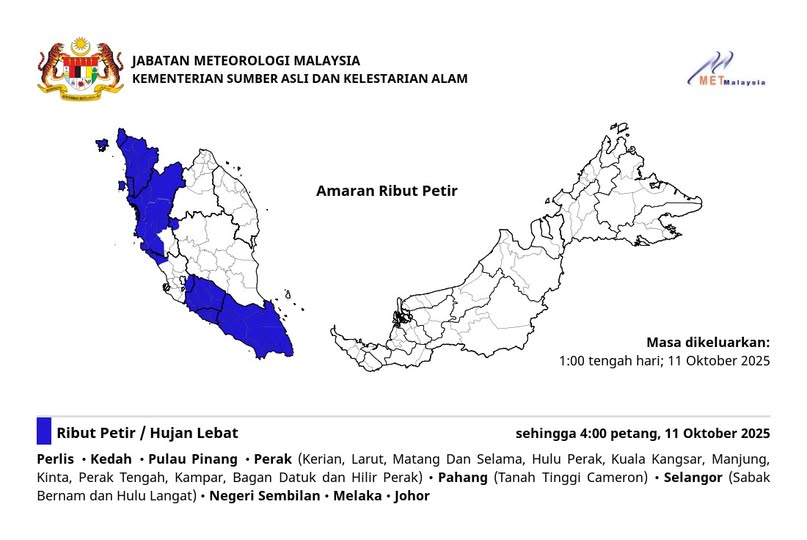 受强对流天气影响,霹雳(居林、拉律、马登与实叻满、上霹雳、江沙、曼绒、近打、中霹雳、金宝、峇眼拿督及下霹雳)、玻璃市、吉打、槟城、彭亨(金马仑高原)、雪兰莪(沙白安南及乌鲁冷岳)、森美兰、马六甲及柔佛,将从即日起至2025年10月11日(星期六)下午4时出现雷电交加、豪雨与强风。