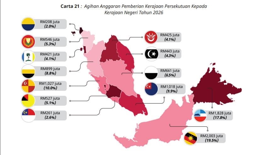 联邦政府在2026年财政预算案中,调高对各州政府的拨款与财政援助,总额从2025年的 98亿3000万令吉 增加至 102亿6000万令吉,涨幅约 4.4%。