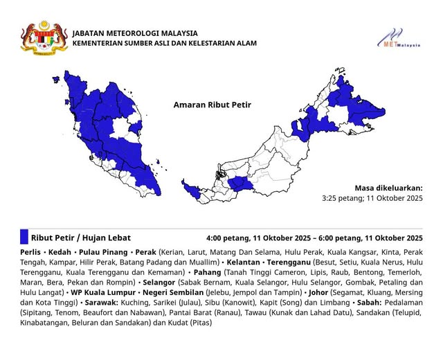 这是来自马来西亚气象局的天气预警。该预警于2025年10月11日下午3时25分发布,预计当天傍晚4时至6时期间将出现雷暴及大雨。