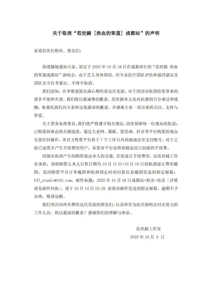 风波持续扩大,范世錡原定于10月18日在成都举行个人演唱会《热血的笨蛋》,却因遭网友集体抵制、票房传出仅售出15张而被迫取消。工作室随后发声明称,因艺人身体不适、经医疗团队评估后决定取消演出,并承诺办理退票与住宿补偿。